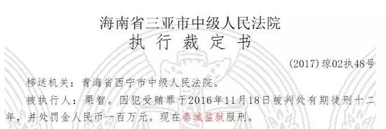 近日,中国裁判文书网公布的一份执行裁定书显示,新疆人大常委会原副主任栗智受贿的财物被追缴,包括:美元8万元、500克金条1根、人民币874.876994万元、位于海南省三亚市半山半岛6期未来水世界8栋的房产一套。经鉴定,该房产价值417.5011万元,房中家电、家具价值为6300元。