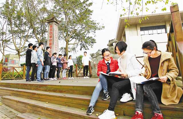 3月29日,重庆忠县中学校园,学生在为纪念28名血洒疆场抗战学友修建的“精忠碑”前学习讨论。记者 卢越 摄