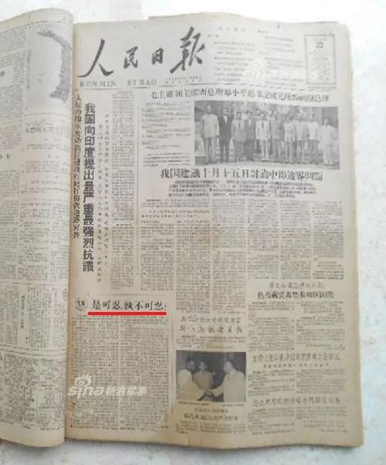 印度独立后,不仅要中国政府承认所谓“麦克马洪线”,还企图进一步侵占中国领土。1962年9月22日《人民日报》头版发表社论《是可忍,孰不可忍》,警告印度尼赫鲁政府,立即从边境撤军,否则中方将使用武力,结尾处点明:“局势是险恶的,后果是严重的,我们要正告印度当局,勿谓言之不预也。”