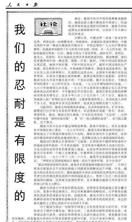 1978年12月25日,面对越南方面的挑衅,《人民日报》发表社论《我们的忍耐是有限度的》:“我们要严正警告越南当局,如果你们仗恃有苏联的支持,得寸进尺,继续恣意妄为,必将受到应得的惩罚。我们把话说在前面,勿谓言之不预。”