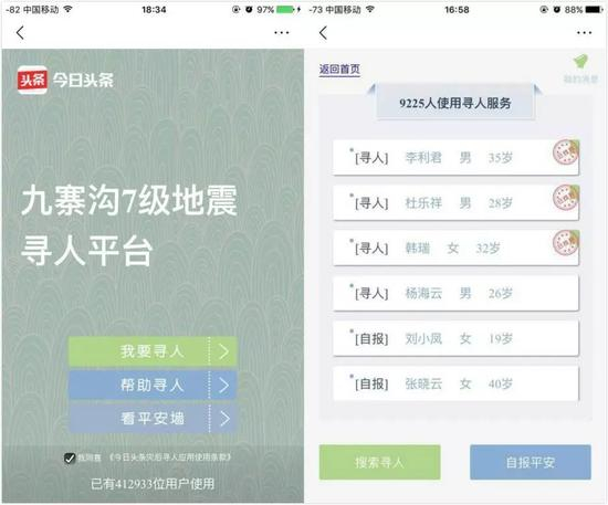 12个小时左右的时间里,便有1516人在平台上提交寻人信息,128人自己报平安,31人通过平台找到,通过自报平安找到的有66人。面对此次突发自然灾害,今日头条显现了其技术特长,通过技术支持和用户资源帮助灾难中的受害群体及其家人,成为求援支援的重要途径。