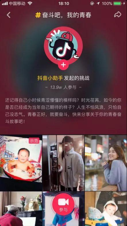 抖音的正能量不仅在吃喝玩上。今年两会期间,抖音发起了“奋斗吧!我的青春”挑战,号召用户通过短视频展现出自己的青春奋斗故事。三天内,超过10万名用户参与了挑战,不少用户通过晒照片、录视频的方式,分享了自己,甚至父辈的奋斗历程。去年,抖音与央视纪录携手发起的“给我五分钟,展现全新国宝,向世界打招呼”活动,让更多的年轻人关注节目,关注传统文化。