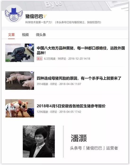 有意思的是,其中不乏90后运营者,比如“猪倌巴巴”背后的运营者是一位名叫潘灝的90后。潘灏所在公司做的是通过网络帮助猪只饲养户解答各式各样的问题。非专业出身的他在日常工作中逐渐对猪产生了浓厚兴趣,就决定把自己喜欢的东西通过自媒体平台分享,从养殖科学、行情分析,到养猪技术科普以及各种疾病的应对,猪倌巴巴就这么诞生了。