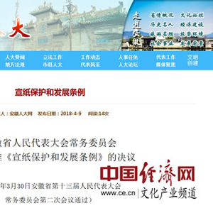 《条例》还表明,对宣纸产业集中的特定区域,安徽泾县人民政府可以设立宣纸文化生态保护区,制定专项保护规划,实行区域性整体保护。