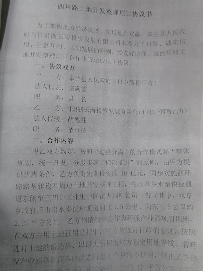 但2013年7月2日,皋兰县政府(甲方)与甘肃浙云海投资发展有限公司(乙方)签约的《西环路土地开发整理项目协议书》及补充开发协议书)显示。代为甲方皋兰县政府签名的法人代表人正是皋兰县原县长宗满德,代为乙方浙云海公司签名的是浙云海公司法人代表胡德胜。