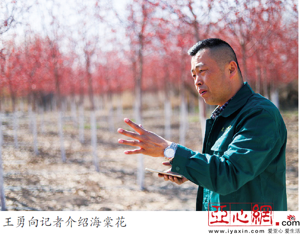 这缘于一次偶然,他说:“一次我在五一农场参观,走累了坐在树下休息,看到一位老人正在跑步,开放的红叶海棠花在路边摇曳生姿,美极了。我问老人,海棠花好看不,老人说这是他见过的最好看的花,可惜有点矮。”老人走后,王勇久久地盯着海棠花,脑海里有了想法。