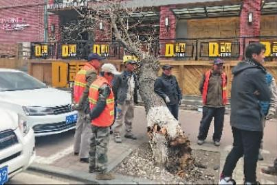 昨天,在同志街与新华路交会附近也有一棵树被风吹倒,记者赶到现场看到,这棵树根部直径约30厘米,高度约10米,倒下时砸在附近一家商户栏杆上,长春市园林部门赶到现场将树锯断后拉走。
