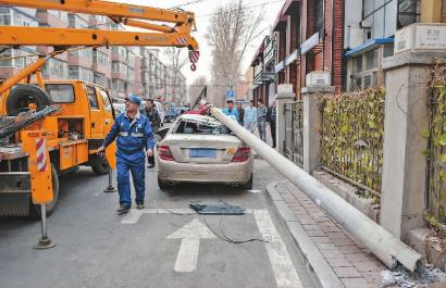 昨天风大,不光吹黄了天,还惹了不少祸。昨天中午12点左右,长春市同志街与明德路南胡同交会附近,接连“哐当”两声,“开始我以为是什么东西碎了,因为声音很脆,趴窗户一看,原来是门口的树倒了。”一家超市老板说,倒地的树根直径超20厘米,树高近20米,堵住了整条胡同。记者赶到现场看到,朝阳区园林管理处工作人员已将倒下的树处理完毕,木屑和细小的树枝被扫成一堆。“这杨树树龄很大,今天风太大,结果就被吹倒了。”一名工作人员说,杨树向北侧倒下时砸到了两根电线,结果电线扯着一根路灯杆一起倒地,杨树和路灯杆各砸坏了一辆私家车,受损不算太严重。而被路灯杆砸到的是一辆“北京奔驰”,顶棚受损严重,前后挡风玻璃均有不同程度破损,所幸当时车内无人。几名抢修人员操作设备将路灯杆吊起,车主于下午2点半左右驾车离开。