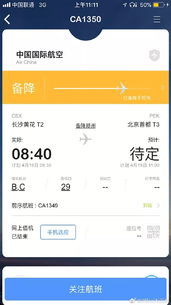 航班信息显示,国航 CA1350 航班, 15 日上午 8 时 40 分从长沙黄花机场起飞,原定于上午 11 时到达首都机场。
