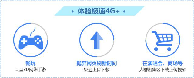 普通的4G网络,通信环境一旦不佳,网速直线下降,而天翼4G+拥有双通道备份,可以保持网络依旧理想。在一些重点核心商圈、交通枢纽、高校、产业园区等流量密集区域,天翼4G+更可大显身手。”