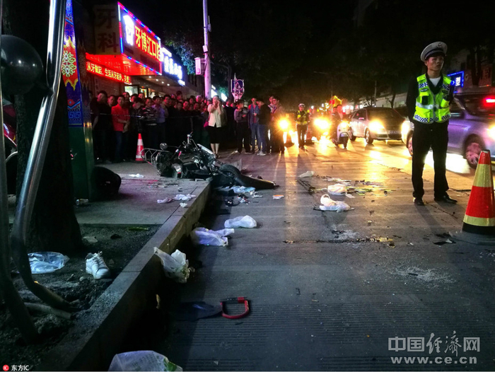 广西河池一轿车闹市撞飞8辆电动车伤7人 现场一片狼藉(组图)