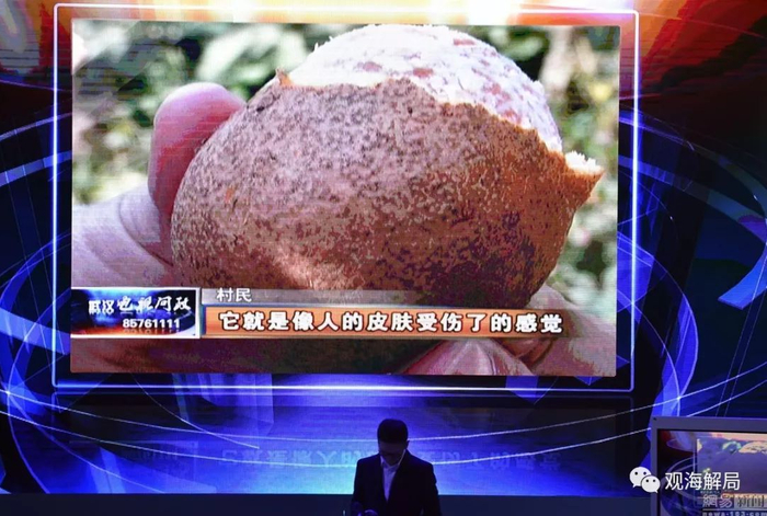 电视问政暗访发现,蔡甸区宋湾村一个橘园因为遭受旁边一家水泥搅拌厂的污染,树上的一些橘子变成了裹上水泥灰的“水泥橘”,在主持人的要求下,彭巧娣吃下了橘子,还说虽然皮难剥,吃着还算甜。