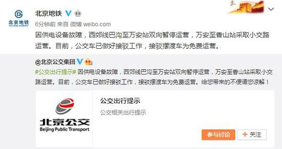 因供电设备故障,西郊线巴沟至万安站双向暂停运营,万安至香山站采取小交路运营。目前,公交车已做好接驳工作,接驳摆渡车为免费运营。