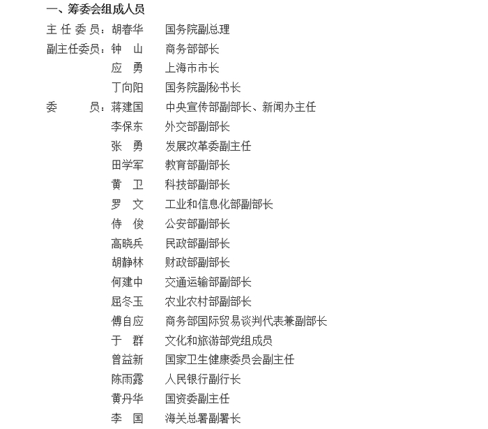 这些成员单位大都有一位副部长参与筹委会,商务部、上海市政府和外交部则有多位部长、副部长级的官员参与其中。
