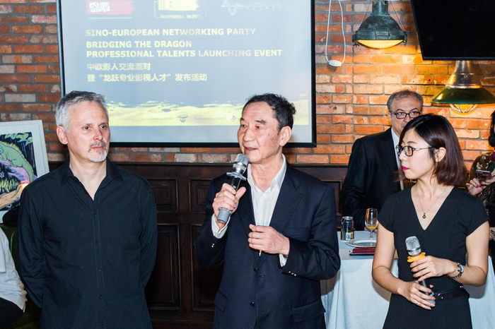 中国电影合作制片公司总经理苗晓天为龙跃活动致辞(左起为龙跃中欧制片人协会创始人克里斯提阿诺·博通,苗晓天总经理,龙跃中国负责人张凡)