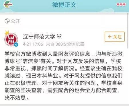 针对此事,@洁洁良 母校辽宁师范大学官方微博于21日17:06分发表回应: