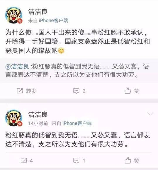 近日,一个新浪微博名为@洁洁良 的账号(下文简称@洁洁良,目前用户已注销账号)公开发布辱华言论,这件事情在网络上持续发酵,引起大量网友关注。
