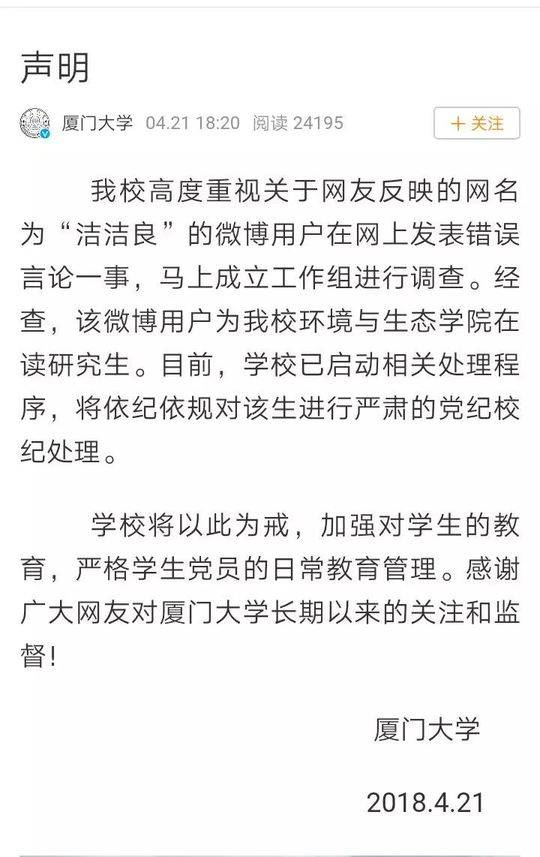 厦门大学官方微博在21日18:20分发表声明:
