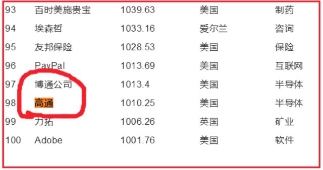 搞半导体芯片的博通估值1013亿,排名第97,而神乎其神的高通公司,市值1010亿,排名第98。它俩不如卖垃圾食品的麦当劳(1481亿,58位),更不如卖烟草的英美烟草公司(1573亿,54位)。