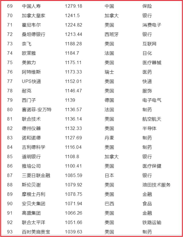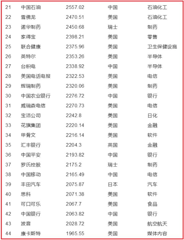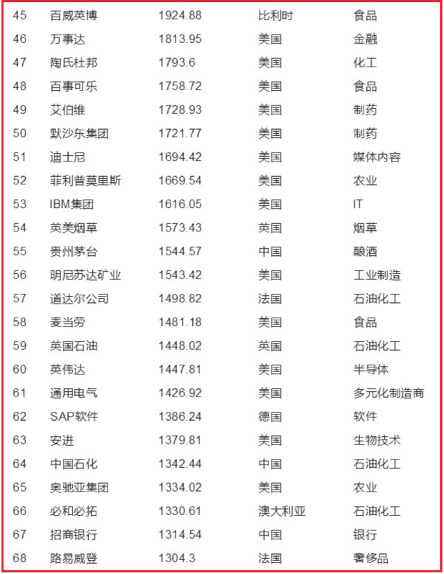 比如英特尔市值2353亿,排名第26,不如瑞士一家卖咖啡的雀巢。后者市值2619亿,排名第20。