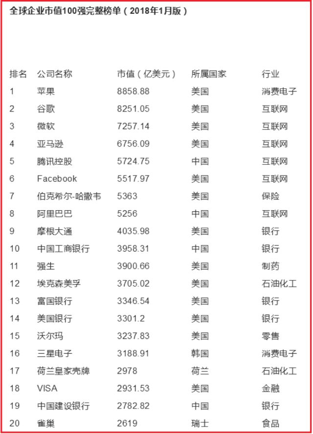 第一,有一点是没错的,世界市值前几名中,美国的高科技企业的确长期霸占榜单,比如苹果、谷歌、微软、亚马逊、Facebook。