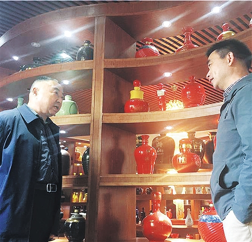 叶志钢(左)在银和瓷业向该企业董事长了解瓷酒瓶新产品的研发与市场动态。 记者 刘 麟摄