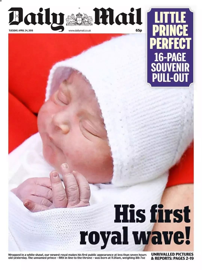 24日,英国《每日邮报》用全版刊登了小王子在襁褓中的特写照片。