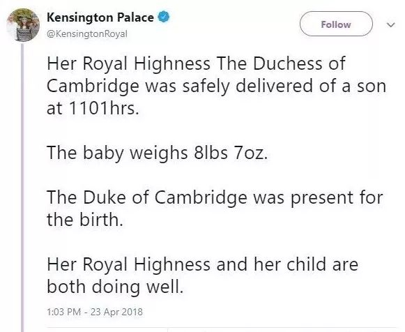 按照皇室惯例,此次小王子在诞生前依然没有提前公布性别,出生后才由肯辛顿宫通报。小王子的哥哥乔治王子和姐姐夏洛特公主也在威廉王子的带领下看望了刚出生的小弟弟。