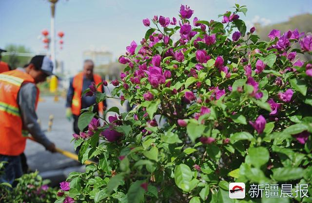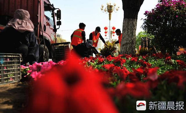 4月23日,乌鲁木齐市友好北路,沙依巴克区园林队工作人员在摆放三角梅等花卉。