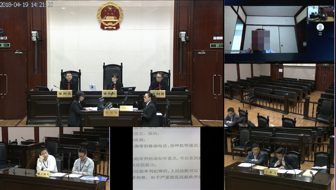 庭审现场,右上角屏幕中为正在日本的出庭证人。
