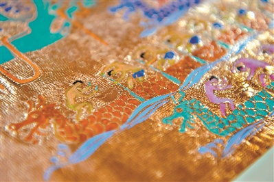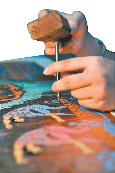 铜箔又是如何与剪纸联系上的呢?梁诗裕表示,由于剪纸的特殊性和基础性,当时佛山发达手工艺无论是陶瓷、秋色、灯色、炮仗、刺绣、铸造等都要与剪纸挂钩,陶瓷图案、灯色的图案、铸造的花纹等都需要剪纸图案的串联。因而剪纸成为当时佛山的手工艺里发达的行当。而后人们的审美发生了变化,人们发现剪纸作品不像铜箔一样有金属光泽。于是大家尝试在铜箔上凿一些小点,通过点来呈现线,通过线来展示图案造型,然后在造型上涂上颜色,一种新的艺术品种便诞生了。这个时候剪纸就与铜箔联系上了,“这个时期,剪纸艺人基本上都掌握着佛山铜凿剪纸这门技艺。”