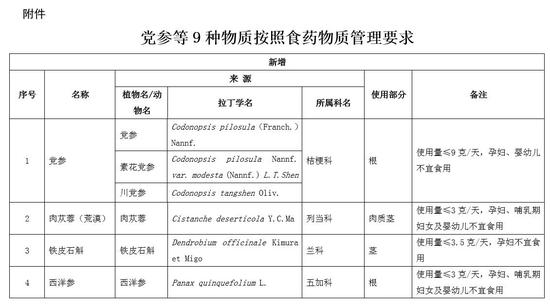 附件:党参等9种物质按照食药物质管理要求