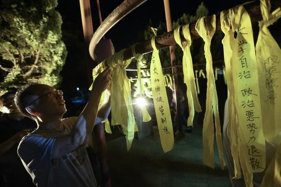 台大学生28日晚间在脸书上发帖,呼吁师生晚上10点在台大精神象征“傅钟”前集合,在校园内绑黄丝带,声援大学自治,拒绝政治力入侵校园。当天晚上,数十位师生在傅钟前集结,还有不少校外民众前往声援。