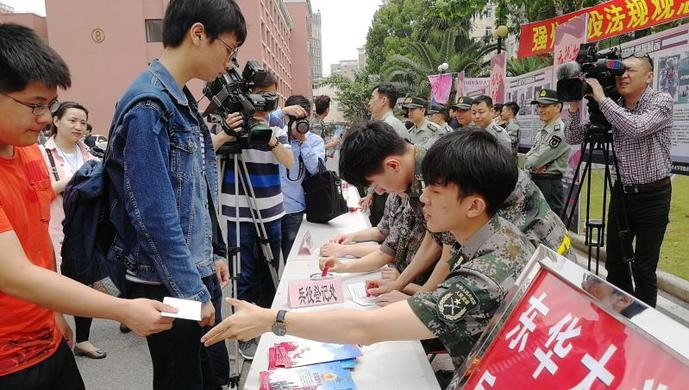 一年一度的大学生征兵工作近日全面展开,5月2日是上海高校开展现场兵役登记的第一天。上午,东华大学举办2018年大学生征兵现场兵役登记和咨询活动。