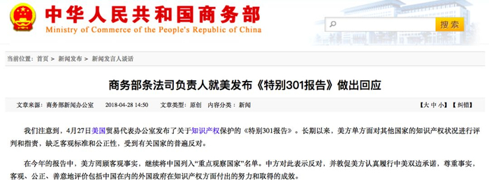 就在白宫公布访华贸易代表团前夕,4月28日,据中国商务部官网消息,美国贸易代表办公室发布了关于知识产权保护的《特别301报告》,该报告继续将中国列入“重点观察国家”名单。对此,中国商务部条法司负责人表示,长期以来,美方单方面对其他国家的知识产权状况进行评判和指责,缺乏客观标准和公正性。中方对此表示反对,并敦促美方认真履行中美双边承诺。