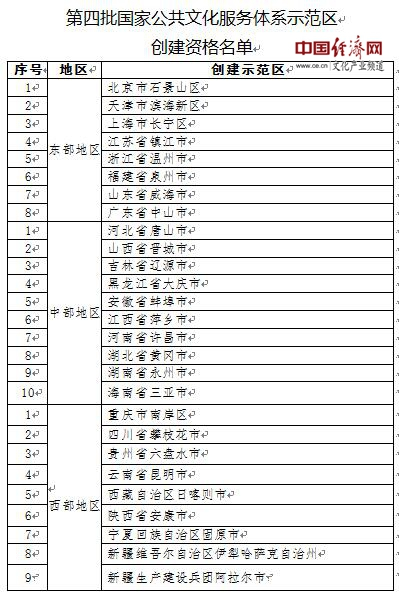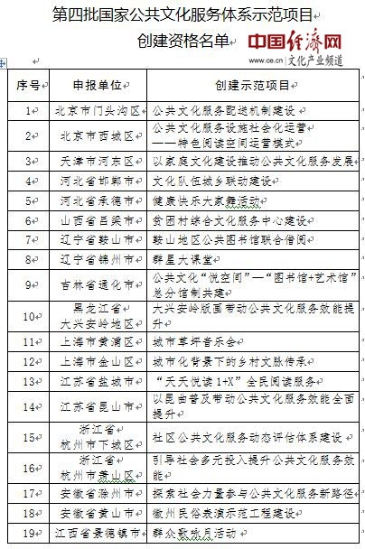据经济日报-中国经济网记者了解,2017年8月10日,原文化部、财政部印发了《关于开展第四批国家公共文化服务体系示范区(项目)创建工作的通知》,启动了第四批国家公共文化服务体系示范区(项目)创建工作。经过各地申报、专家集中评审、公示等环节,产生了此次第四批国家公共文化服务体系示范区(项目)创建资格名单。