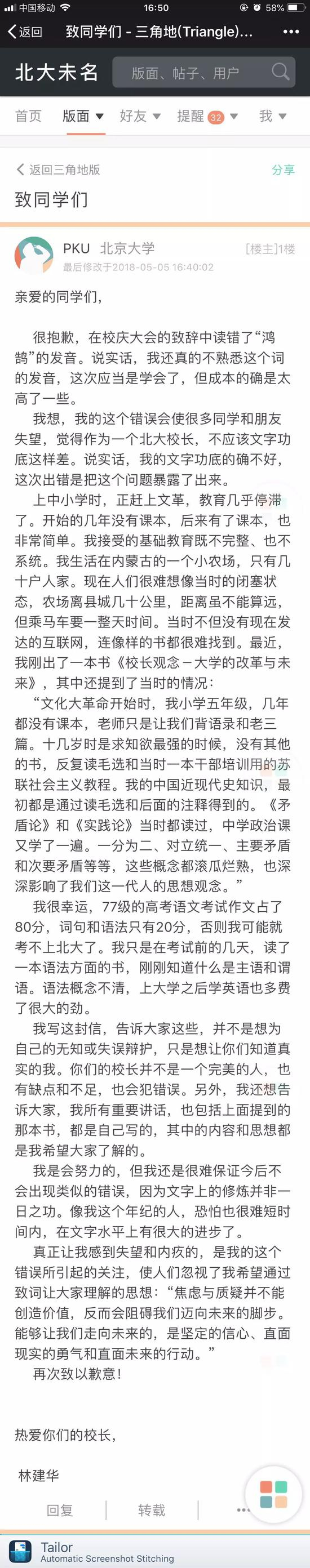 我写这封信,告诉大家这些,并不是想为自己的无知或失误辩护,只是想让你们知道真实的我。你们的校长并不是一个完美的人,也有缺点和不足,也会犯错误。另外,我还想告诉大家,我所有重要讲话,也包括上面提到的那本书,都是自己写的,其中的内容和思想都是我希望大家了解的。