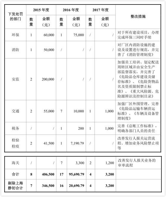 2015年6月1日,上海市嘉定区环境保护局第2120150113号行政处罚决定书显示,上海静初恢复在华亭镇武双路12 弄18号的油漆、塑料粒子、钛白粉、除草剂等的仓储生产经营,未向环保部门办理通过环境影响评价文件审批手续和建设项目环保设施竣工验收手续。上海市嘉定区环境保护局责令其停止生产、罚款60,000元。