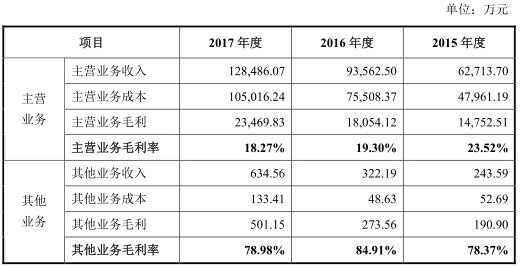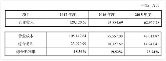 2015年至2017年,密尔克卫综合毛利率逐年下滑,分别为23.74%、19.52%和18.56%。