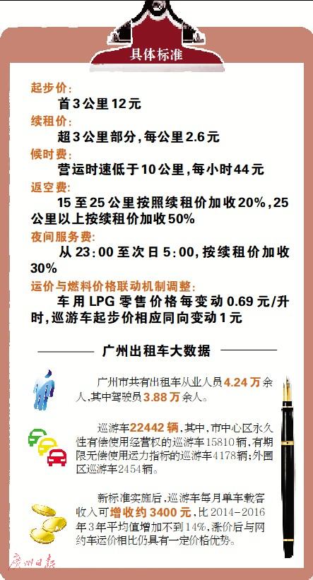 目前,广州巡游车运价水平在一线城市中处于最低水平。北京、上海、深圳巡游车现行整体运价水平分别比广州高10.34%、22.77%、24.46%。新标准实施后,广州出租车运价略高于北京,但仍低于上海、深圳。按照之前测算,新标准实施后,巡游车每月单车载客收入可增收约3400元,比2014-2016年3年平均值增加不到14%,涨价后与网约车运价相比仍具有一定价格优势。