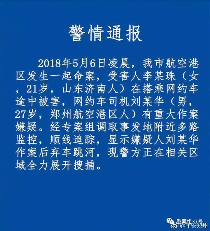 10日晚,平安郑州发布通报称,5月6日凌晨,郑州航空港区发生一起命案,受害人李某珠(女,21岁,山东济南人)在搭乘网约车途中被害,网约车司机刘某华(男,27岁,郑州航空港区人)有重大作案嫌疑。经专案组调取事发地附近多路监控,顺线追踪,显示嫌疑人刘某华作案后弃车跳河,现警方正在相关区域全力展开搜捕。