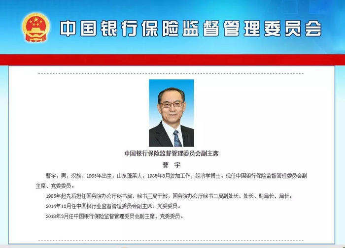 另外一位就是曹宇了,他历任国办秘书局、秘书三局干部,国办秘书二局副处长、处长、副局长、局长。2014年12月任中国银行业监督管理委员会副主席、党委委员。这次机构改革之后,成立银保监会,今年4月,国务院任免国家工作人员,明确曹宇出任银保监会副主席。