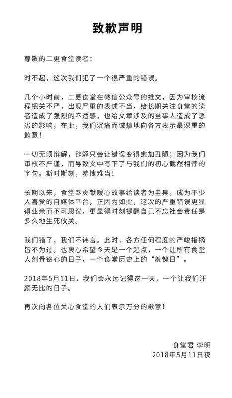 文章不顾逝者尊严与家人感情,用词大胆、媚俗,甚至出现不堪的色情想象,被网友批评是“拿悲剧做营销”。当晚,该自媒体发文致歉。5月12日,浙江省、杭州市网信办也联合约谈“二更食堂”负责人,要求严肃处理有关责任人,并限时提交整改报告。