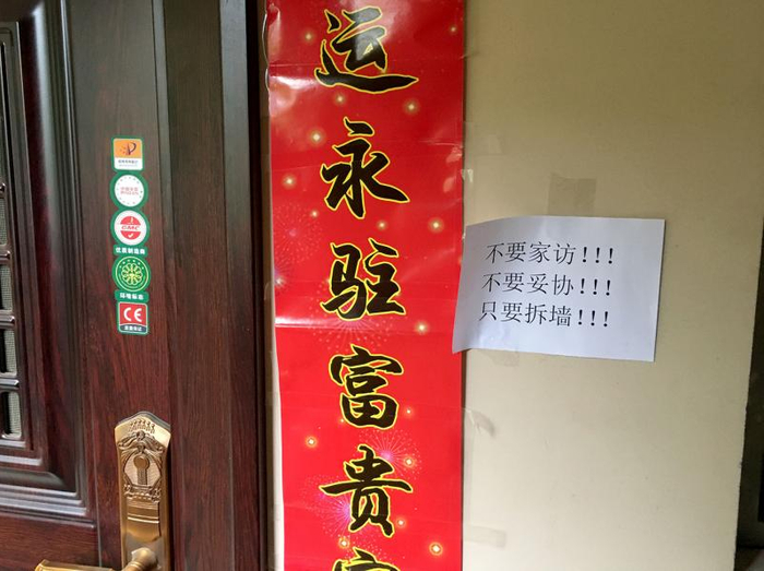 玉璞家园居民对于围墙的芥蒂很难无视:很多家门口,都贴着A4纸打印的告示。写着“拆除隔离,拒绝家访”、“请勿打扰,坚决拆墙”、“不要家访,不要妥协,只要拆墙”的字样。