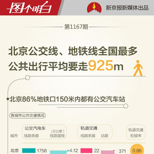 对于普通人而言,关心更多的是公共出行方不方便?站台好不好找?从全国看,公共汽电车网络500~800m平均站距的线路占55%,轨道交通平均站距近半集中在1000m-1500m这一区间。因为站点密度,以及站点与住宅小区、办公区门口等间距不同,城市公共出行步行距离也有差异,其中上海达1.3千米,深圳为809米。(更多新闻,请关注新京报微信公号:bjnews_xjb)