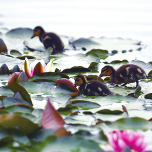 约10分钟后,野鸭队伍抵达西边的睡莲、芦苇等植物区域。12只小野鸭在“鸭妈妈”指挥下,在绽放的睡莲、茂密的芦苇丛中游动着寻觅食物。