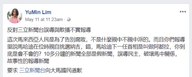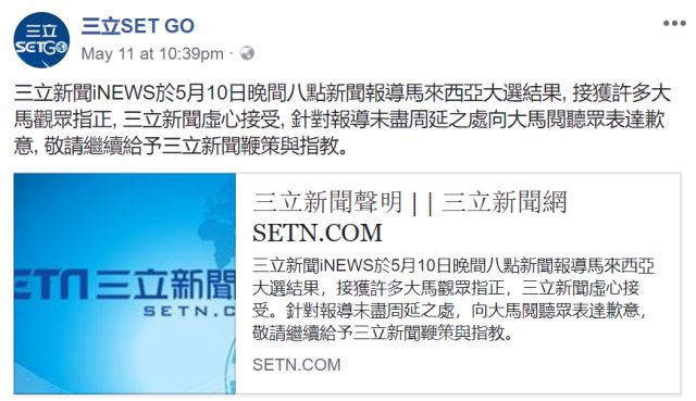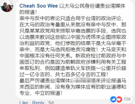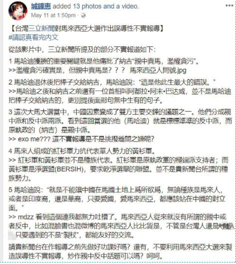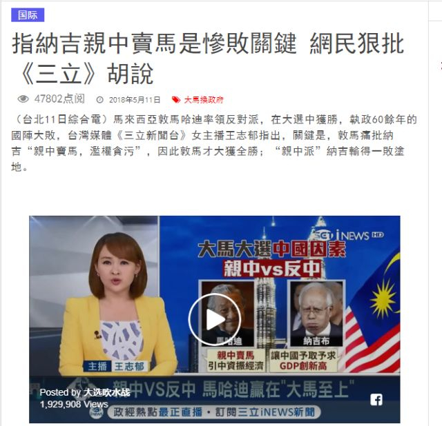 根据马来西亚媒体的报道,三立新闻在马来西亚大选结果公布后做了一期专题节目,可这家坚决支持民进党台独立场的媒体,却将马来西亚人对原政府“贪污腐败、损害民生”的不满,歪曲成了是对原政府“亲中”的不满,并将新当选的马哈蒂尔政府直接打上了“反中”的标签,然后就开始意淫中国遭到马来西亚人的厌恶这一荒诞的结论了。