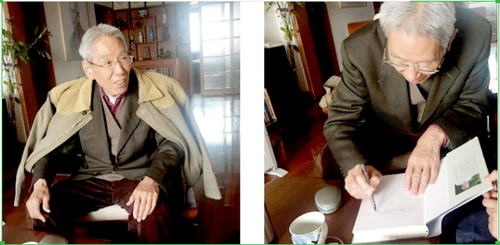 先生的家很空旷,他说他常“漂泊”,看得出生活简单又秩序。先生的书房不是很大,很多书,铺满了两面的墙,挂在墙上的“洗耳斋”三个字,是心态,我觉得更是一种境界。客厅里面那幅经常被刊发的画像就立在眼前,下面横着一个鹿的雕塑。为了我们的到来,他准备了茶和香蕉。不能免俗的,我们请先生签名赠了书。11月的天津,印象中也是很冷,没有暖气的屋子里面先生穿得很厚,还披了一件土黄色的外套,虽然对话的时候要声音很大,但是他都听得到。