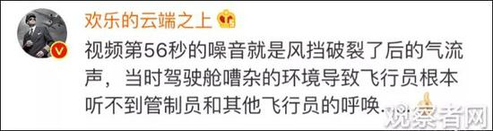 有专业的民航人士指出,视频第56秒出现的噪音,就是风挡破裂后的气流声。驾驶舱内嘈杂的环境让飞行员根本听不到空管的呼唤。