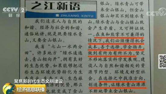 9天后,习近平在浙江日报《之江新语》发表评论《绿水青山也是金山银山》,明确指出,“在鱼和熊掌不可兼得的情况下,我们必须懂得机会成本,善于选择,学会扬弃,做到有所为有所不为。在选择之中找准方向,创造条件,让绿水青山源源不断地带来金山银山”。